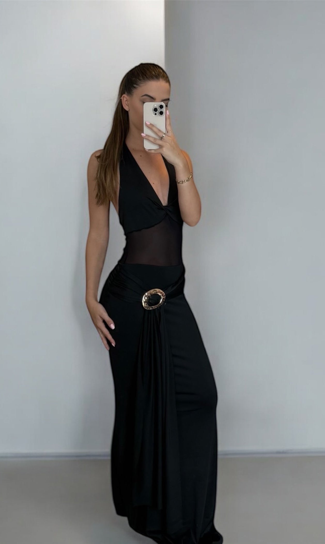 Longue robe noire élégante, sublimée par un détail transparent au niveau du ventre, qui dévoile subtilement la peau pour une touche de mystère et de sensualité.