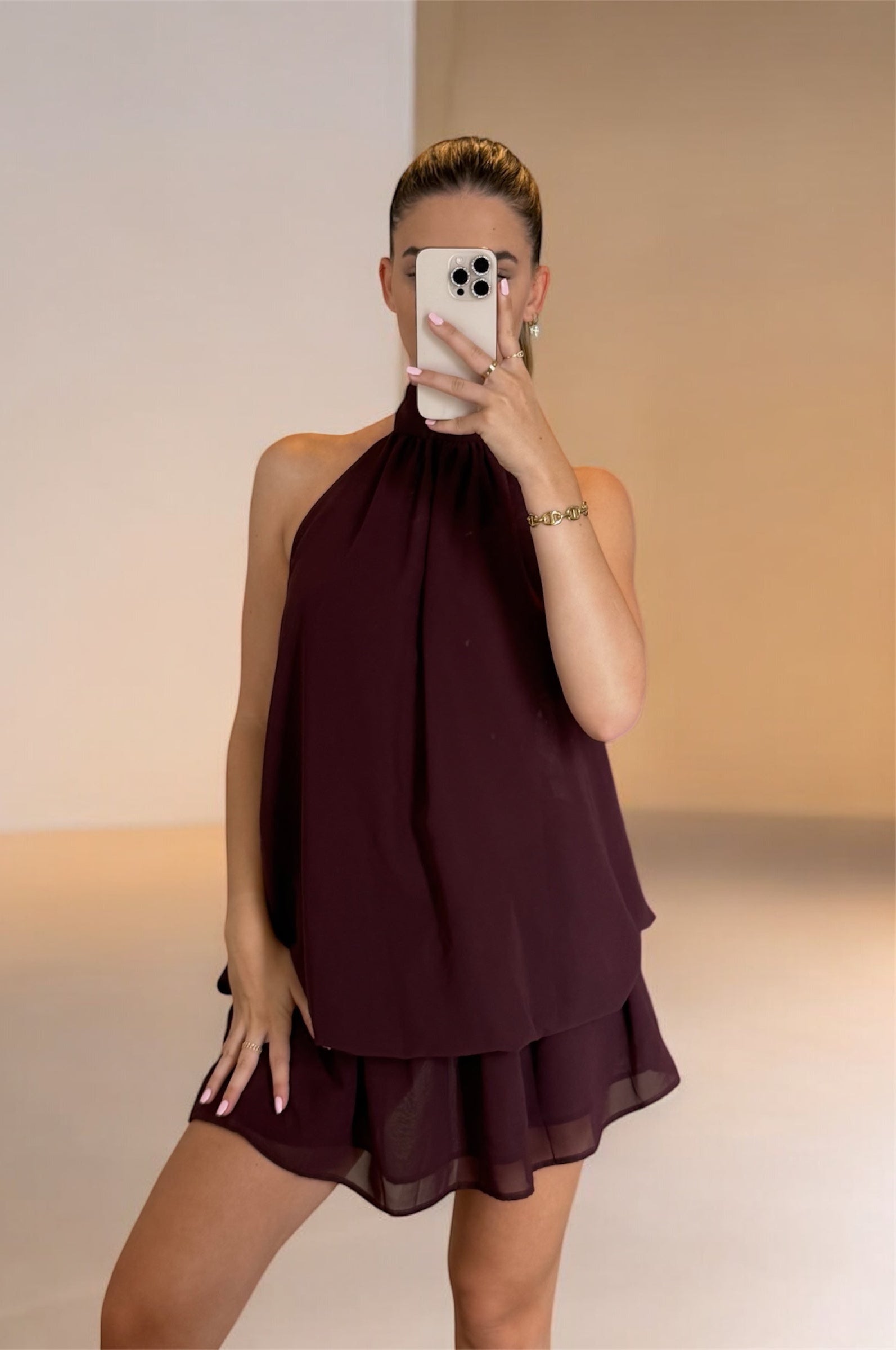 Petite robe courte à l’attache autour du cou, qui met en valeur les épaules et la silhouette avec élégance.
